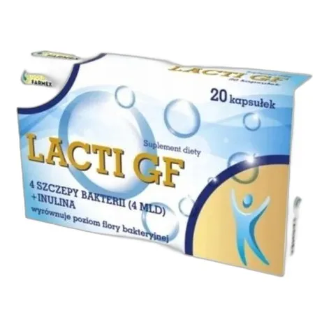 - Probiotyk Lacti GF to suplement diety zawierający mikroflorę jelitową, która wspiera prawidłowe funkcjonowanie układu pokarmowego. Produkt jest przeznaczony dla osób chcących uzupełnić dietę o korzystne bakterie probiotyczne.